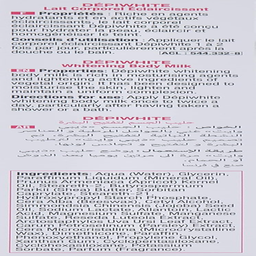 Rich in moisturizing agents and brightening plant active ingredients, Depiwhite Brightening Moisturizing Milk has been designed to moisturize, brighten and homogenize complexion.
