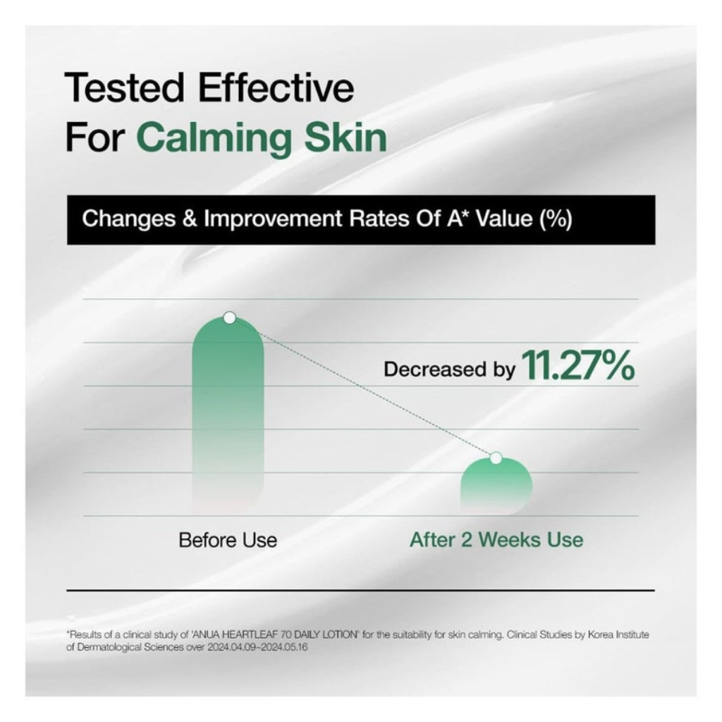 - Apply 1-2 pumps of Anua Heartleaf 70% Daily lotion on your fingers and apply all over the face and neck